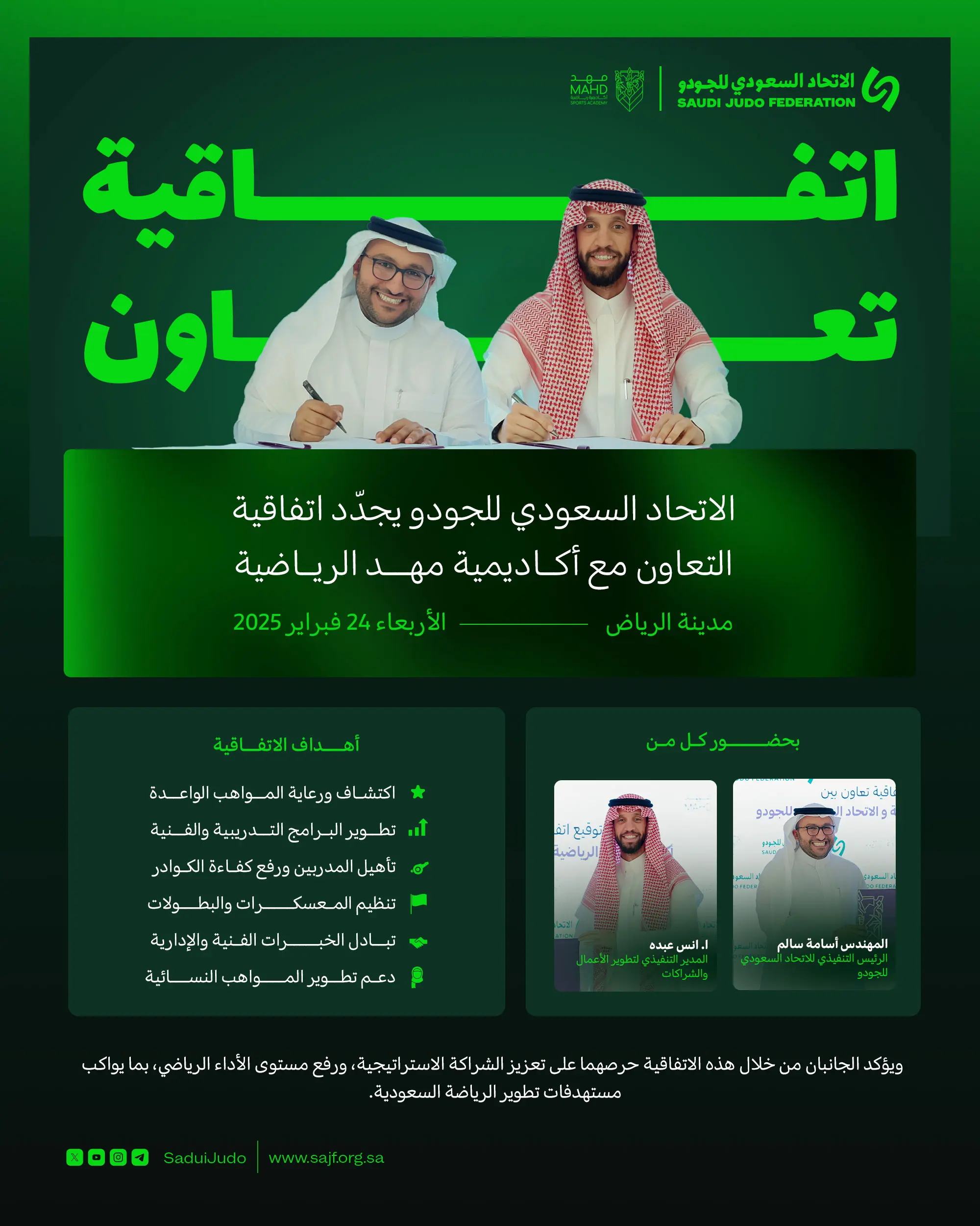 جدّد الاتحاد السعودي للجودو اتفاقية التعاون مع أكاديمية مهد الرياضية، استمرارًا للشراكة الاستراتيجية بين الجانبين، بما يسهم في اكتشاف وتطوير المواهب، وتعزيز البرامج التدريبية، ودعم بناء قاعدة تنافسية قوية لرياضة الجودو في المملكة.